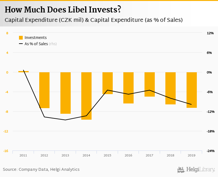 Libel invested a total of CZK -7.25 mil in 2019, down 10.7% compared to the previous year. Historically, between 2011 - 2019, the company's investments stood at a high of CZK 0.278 mil in 2011 and a low of CZK -9.62 mil in 2014.
