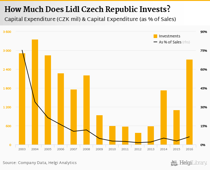 As far as Lidl Czech Republic's peers are concerned, Ahold Czech Republic invested CZK 974 mil, or 1.96% of its sales in 2016. Comparable figures for BILLA Czech Republic are CZK 493 mil and 2.16%.