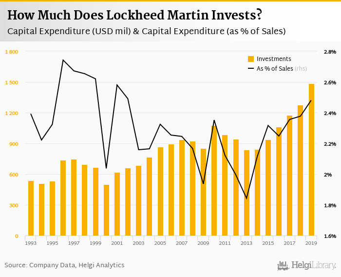 Lockheed Martin invested a total of USD 1,484 mil in 2019, up 16.1% compared to the previous year. Historically, between 1993 - 2019, the company's investments stood at a high of USD 1,484 mil in 2019 and a low of USD 500 mil in 2000.