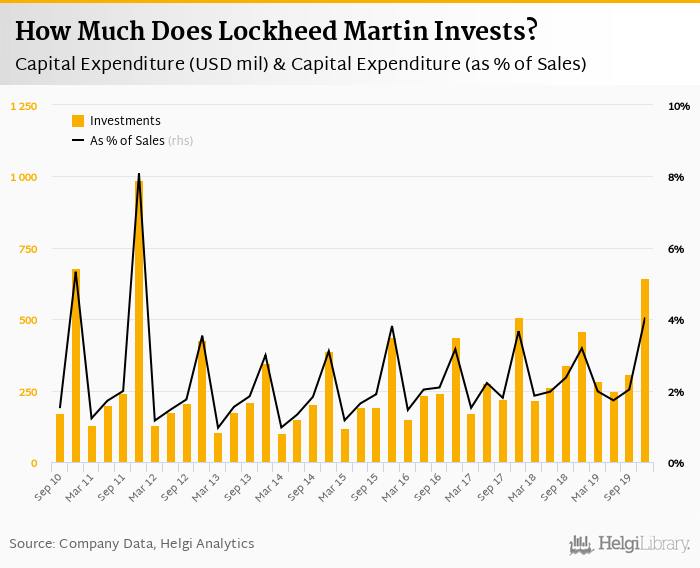 Lockheed Martin invested a total of USD 643 mil in 4Q2019, up 40.1% compared to the previous year. Historically, between 1Q2010 - 4Q2019, the company's investments stood at a high of USD 987 mil in 4Q2011 and a low of USD 92.0 mil in 1Q2010.