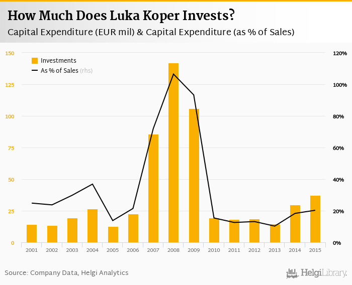 Luka Koper invested a total of EUR 37.4 mil in 2015, up 24.8% compared to the previous year. Historically, between 2001 - 2015, the company's investments stood at a high of EUR 142 mil in 2008 and a low of EUR 12.8 mil in 2005.