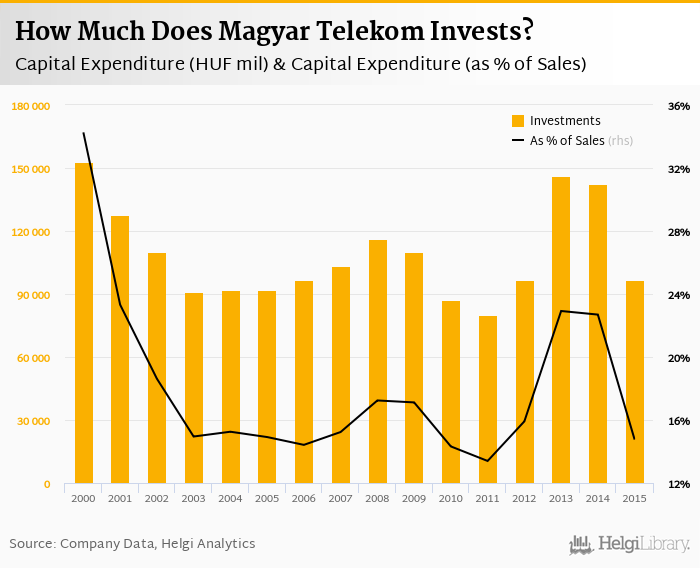 As far as Magyar Telekom's peers are concerned, Telekom Austria invested EUR 727 mil, or 18.0% of its sales in 2015. Comparable figures for Orange Polska (TPSA) are PLN 1,998 mil and 16.9%.