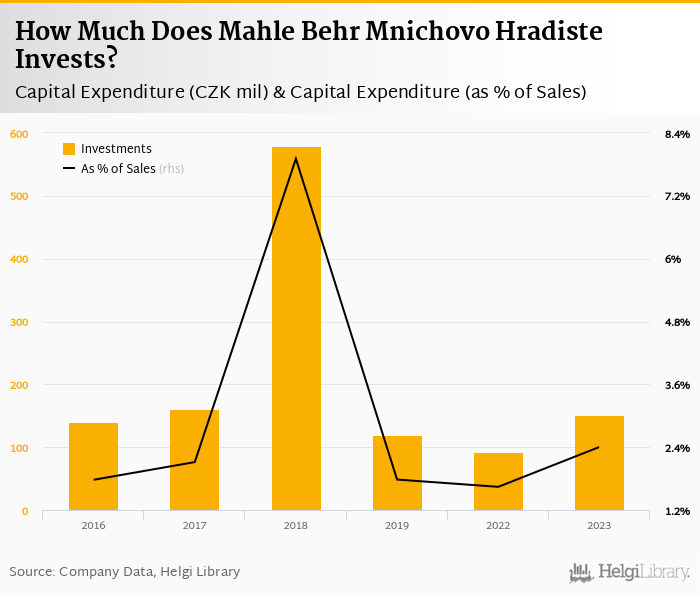 Mahle Behr Mnichovo Hradiste invested a total of CZK 151 mil in 2023, up 64.1% compared to the previous year. Historically, between 2016 - 2023, the company's investments stood at a high of CZK 579 mil in 2018 and a low of CZK 92.0 mil in 2022.