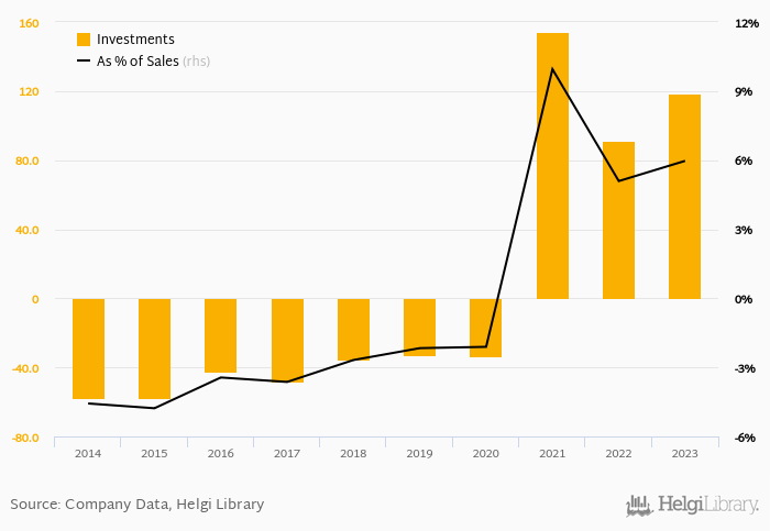 As a percentage of total sales, investments stood at 5.97% in 2023, up from 5.09% as seen in the previous year. This is compared to an average of 3.35% over the last five years.