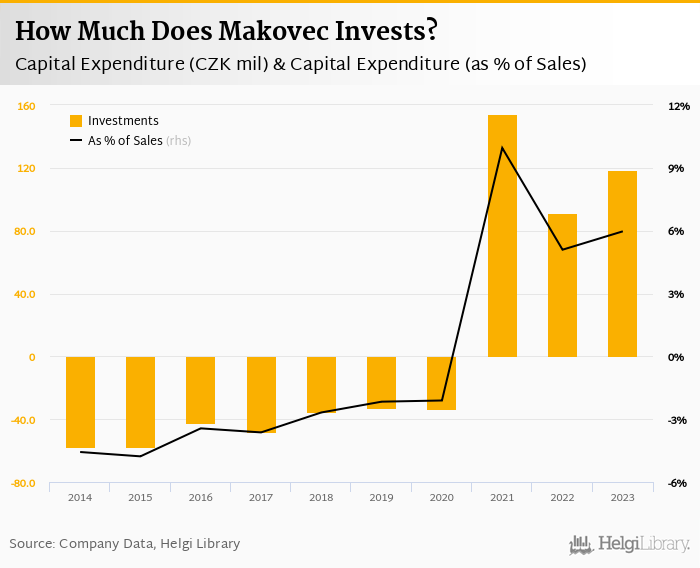 Makovec invested a total of CZK 119 mil in 2023, up 30.6% compared to the previous year. Historically, between 2014 - 2023, the company's investments stood at a high of CZK 155 mil in 2021 and a low of CZK -58.0 mil in 2015.