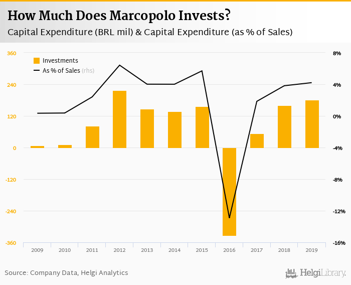 Marcopolo invested a total of BRL 182 mil in 2019, up 13.3% compared to the previous year. Historically, between 2009 - 2019, the company's investments stood at a high of BRL 216 mil in 2012 and a low of BRL -332 mil in 2016.