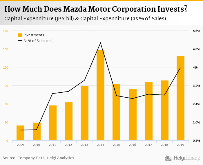 Mazda Motor Corporation invested a total of JPY 139 bil in 2019, up 41.3% compared to the previous year. Historically, between 2009 - 2019, the company's investments stood at a high of JPY 149 bil in 2014 and a low of JPY 24.9 bil in 2009.
