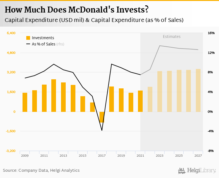 McDonald's invested a total of USD 1,738 mil in 2021, up 13% compared to the previous year. Historically, between 2009 - 2021, the company's investments stood at a high of USD 2,655 mil in 2012 and a low of USD -885 mil in 2017.