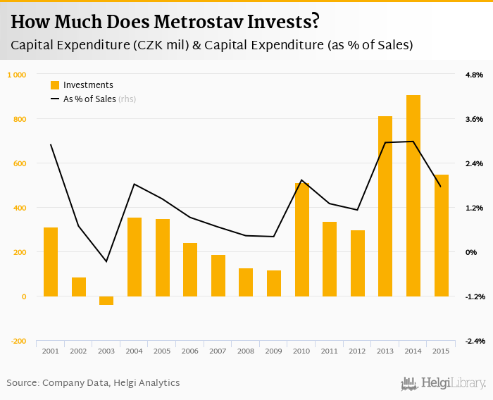 Metrostav invested a total of CZK 550 mil in 2015, down 39.4% compared to the previous year. Historically, between 2001 - 2015, the company's investments stood at a high of CZK 908 mil in 2014 and a low of CZK -38.3 mil in 2003.