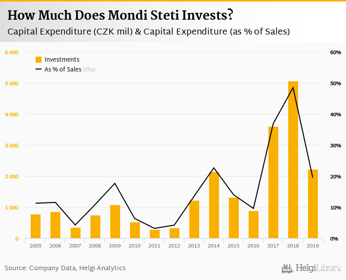 Mondi Steti invested a total of CZK 2,227 mil in 2019, down 56% compared to the previous year. Historically, between 2005 - 2019, the company's investments stood at a high of CZK 5,061 mil in 2018 and a low of CZK 287 mil in 2011.