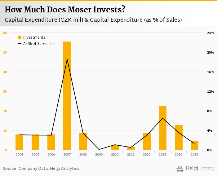 Moser invested a total of CZK 4.78 mil in 2015, down 62.4% compared to the previous year. Historically, between 2004 - 2015, the company's investments stood at a high of CZK 55.6 mil in 2007 and a low of CZK 0.085 mil in 2009.