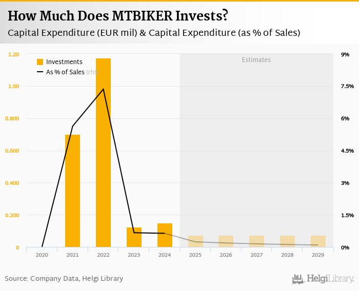 MTBIKER invested a total of EUR 0.150 mil in 2024, up 20% compared to the previous year. Historically, between 2020 - 2024, the company's investments stood at a high of EUR 1.18 mil in 2022 and a low of EUR 0 mil in 2020.