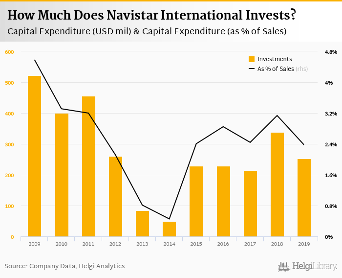 Navistar International invested a total of USD 253 mil in 2019, down 25.1% compared to the previous year. Historically, between 2009 - 2019, the company's investments stood at a high of USD 523 mil in 2009 and a low of USD 50.0 mil in 2014.