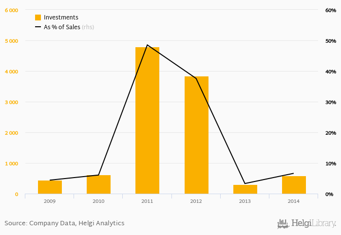 As a percentage of total sales, investments stood at 6.63% in 2014, up from 3.30% as seen in the previous year. This is compared to an average of 20.4% over the last five years.