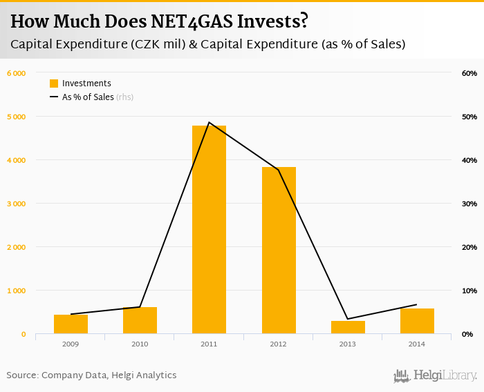 As far as NET4GAS's peers are concerned, RWE Transgas Czech Republic invested CZK 0.450 mil, or < 0.001% of its sales in 2014. Comparable figures for CEZ are CZK 34,417 mil and 17.6%.