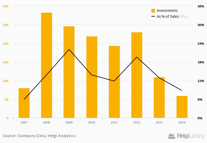 As a percentage of total sales, investments stood at 8.82% in 2014, down from 12.8% as seen in the previous year. This is compared to an average of 13.4% over the last five years.