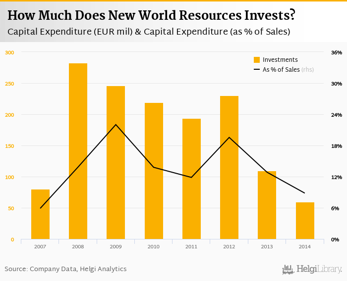 New World Resources invested a total of EUR 59.6 mil in 2014, down 45.4% compared to the previous year. Historically, between 2007 - 2014, the company's investments stood at a high of EUR 282 mil in 2008 and a low of EUR 59.6 mil in 2014.