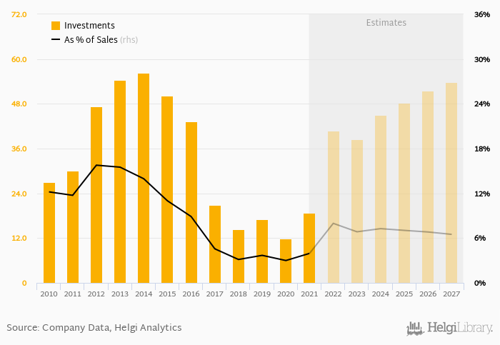 As a percentage of total sales, investments stood at 3.95% in 2021, up from 2.99% as seen in the previous year. This is compared to an average of 3.67% over the last five years.
