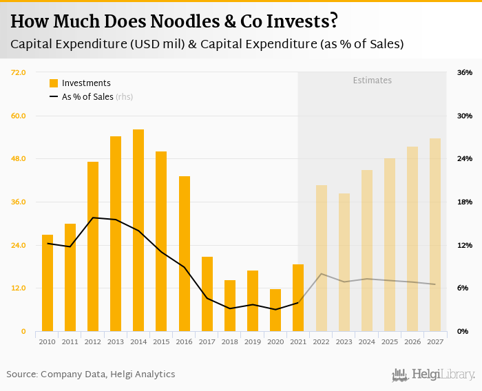 Noodles & Co invested a total of USD 18.8 mil in 2021, up 59.4% compared to the previous year. Historically, between 2010 - 2021, the company's investments stood at a high of USD 56.4 mil in 2014 and a low of USD 11.8 mil in 2020.