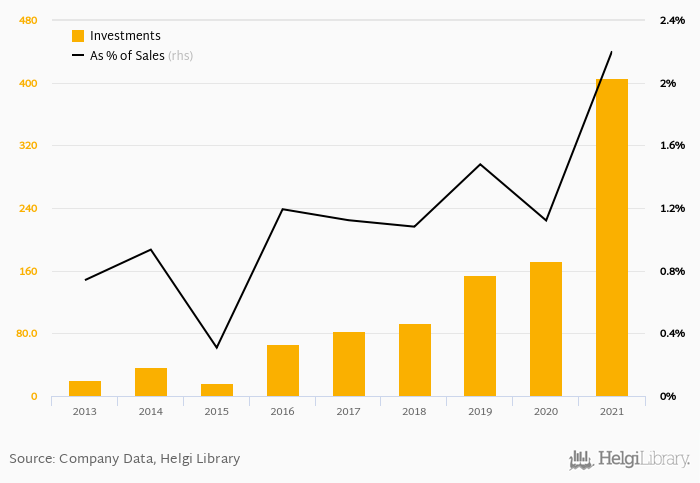 As a percentage of total sales, investments stood at 2.20% in 2021, up from 1.12% as seen in the previous year. This is compared to an average of 1.40% over the last five years.