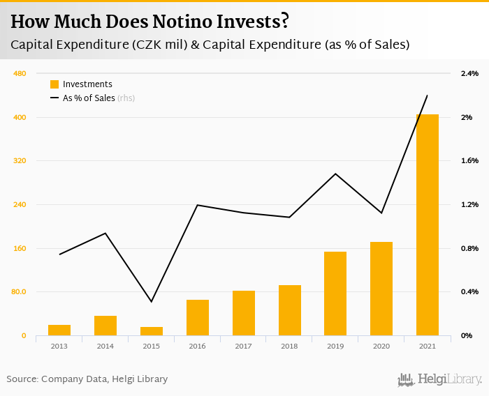 Notino invested a total of CZK 406 mil in 2021, up 135% compared to the previous year. Historically, between 2013 - 2021, the company's investments stood at a high of CZK 406 mil in 2021 and a low of CZK 16.5 mil in 2015.