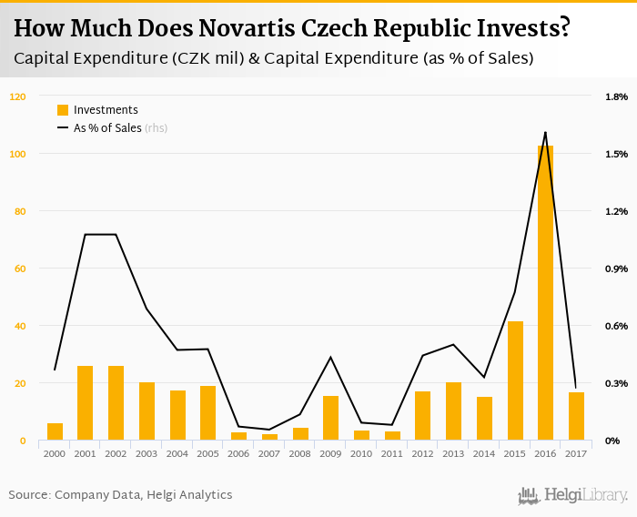 Novartis Czech Republic invested a total of CZK 16.9 mil in 2017, down 83.6% compared to the previous year. Historically, between 2000 - 2017, the company's investments stood at a high of CZK 103 mil in 2016 and a low of CZK 2.34 mil in 2007.