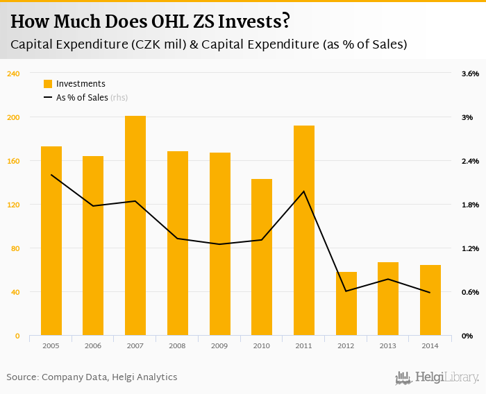 OHL ZS invested a total of CZK 64.7 mil in 2014, down 4.32% compared to the previous year. Historically, between 2005 - 2014, the company's investments stood at a high of CZK 201 mil in 2007 and a low of CZK 58.3 mil in 2012.