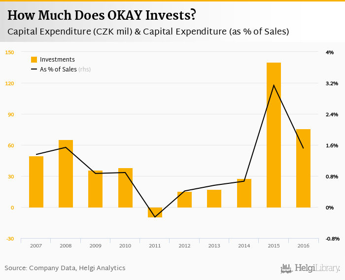 OKAY invested a total of CZK 75.7 mil in 2016, down 46% compared to the previous year. Historically, between 2007 - 2016, the company's investments stood at a high of CZK 140 mil in 2015 and a low of CZK -9.34 mil in 2011.