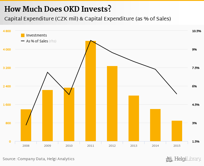 OKD invested a total of CZK 904 mil in 2015, down 36.1% compared to the previous year. Historically, between 2008 - 2015, the company's investments stood at a high of CZK 4,366 mil in 2011 and a low of CZK 904 mil in 2015.