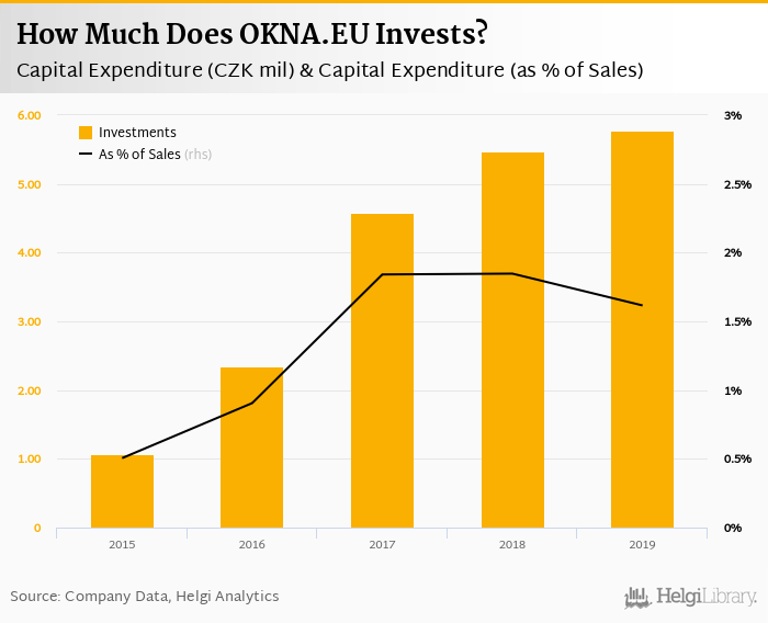 OKNA.EU invested a total of CZK 5.78 mil in 2019, up 5.46% compared to the previous year. Historically, between 2015 - 2019, the company's investments stood at a high of CZK 5.78 mil in 2019 and a low of CZK 1.08 mil in 2015.