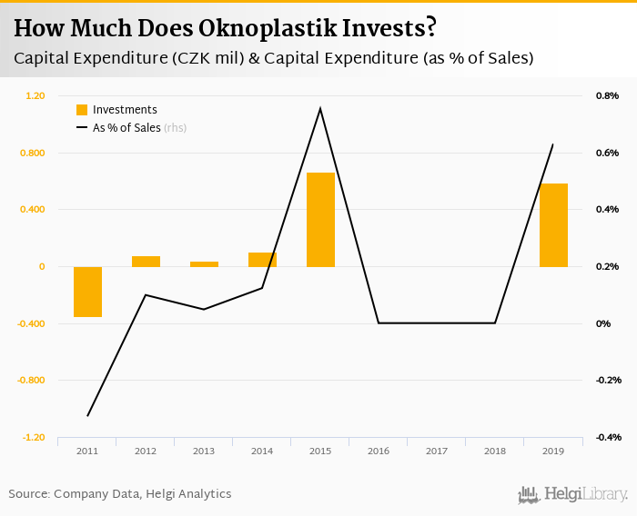 Oknoplastik invested a total of CZK 0.587 mil in 2019, down 0% compared to the previous year. Historically, between 2011 - 2019, the company's investments stood at a high of CZK 0.663 mil in 2015 and a low of CZK -0.350 mil in 2011.