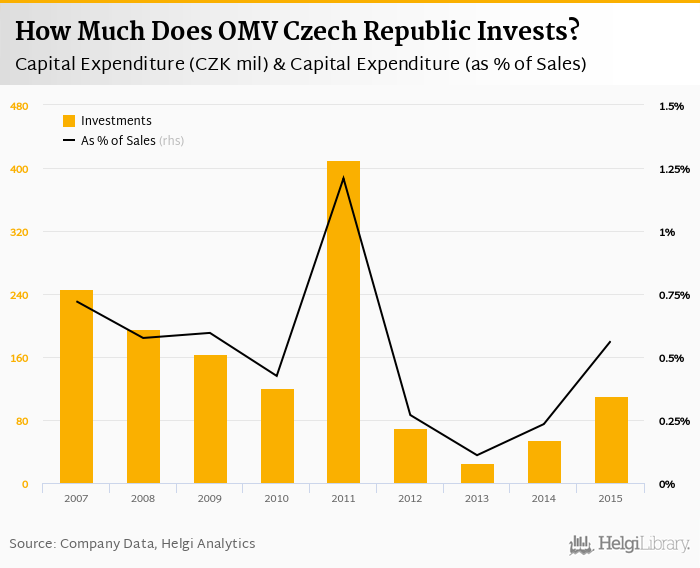 OMV Czech Republic invested a total of CZK 111 mil in 2015, up 100% compared to the previous year. Historically, between 2007 - 2015, the company's investments stood at a high of CZK 410 mil in 2011 and a low of CZK 24.9 mil in 2013.