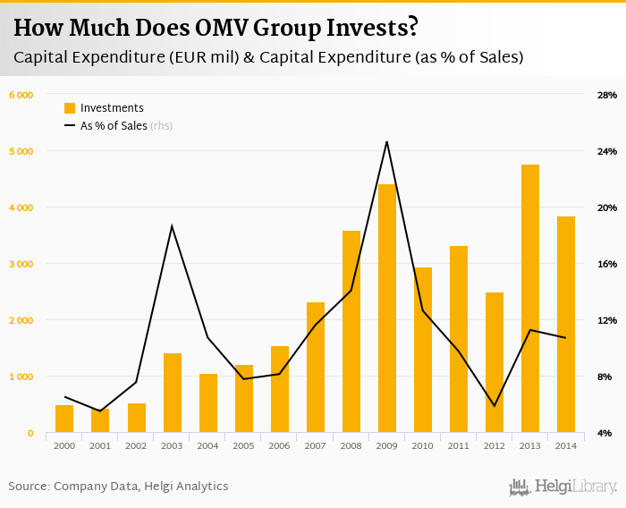 As far as OMV Group's peers are concerned, PKN invested PLN 3,700 mil, or 3.46% of its sales in 2014. Comparable figures for MOL are HUF 356,868 mil and 7.33%.