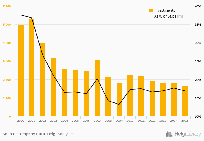 As a percentage of total sales, investments stood at 16.9% in 2015, down from 17.6% as seen in the previous year. This is compared to an average of 17.1% over the last five years.