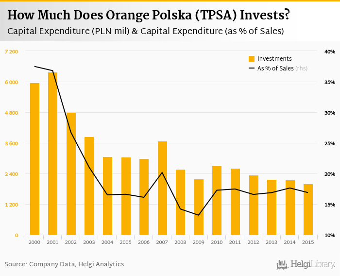 As far as Orange Polska (TPSA)'s peers are concerned, Netia invested PLN 238 mil, or 15.1% of its sales in 2015. Comparable figures for O2 Czech Republic are CZK 2,840 mil and 7.56%.