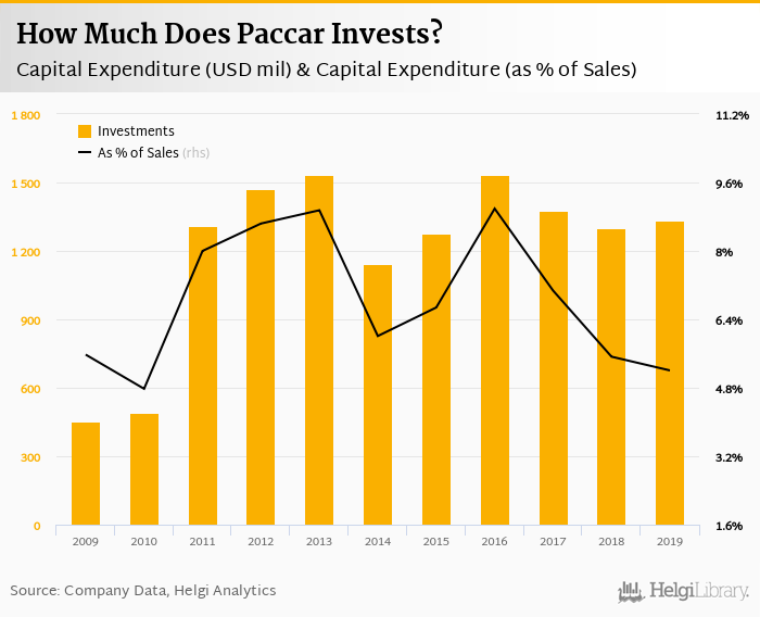 Paccar invested a total of USD 1,333 mil in 2019, up 2.63% compared to the previous year. Historically, between 2009 - 2019, the company's investments stood at a high of USD 1,533 mil in 2013 and a low of USD 451 mil in 2009.