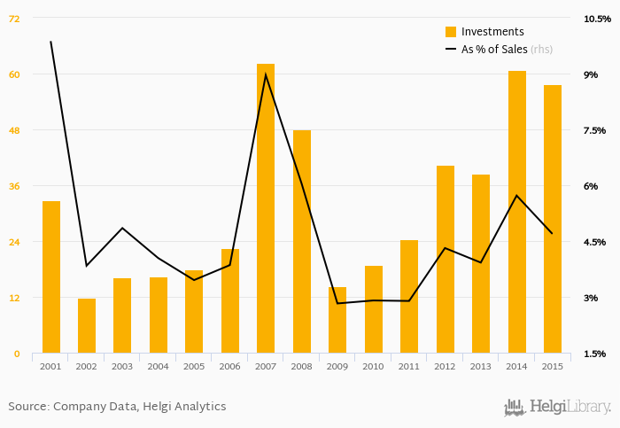 As a percentage of total sales, investments stood at 4.69% in 2015, down from 5.72% as seen in the previous year. This is compared to an average of 4.31% over the last five years.