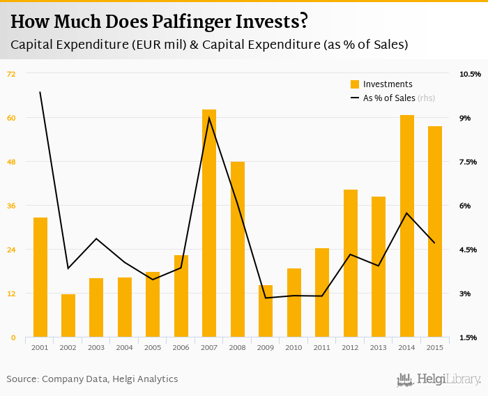 Palfinger invested a total of EUR 57.7 mil in 2015, down 5.18% compared to the previous year. Historically, between 2001 - 2015, the company's investments stood at a high of EUR 62.3 mil in 2007 and a low of EUR 11.8 mil in 2002.