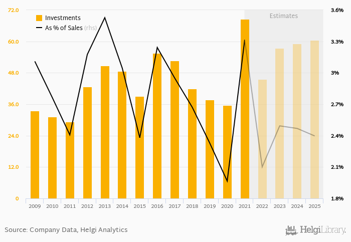 As a percentage of total sales, investments stood at 3.31% in 2021, up from 1.97% as seen in the previous year. This is compared to an average of 2.65% over the last five years.
