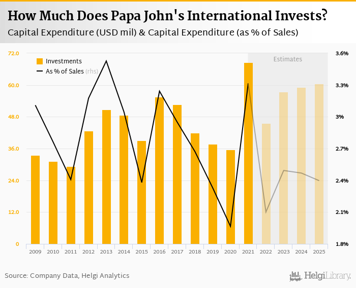 Papa John's International invested a total of USD 68.6 mil in 2021, up 92.3% compared to the previous year. Historically, between 2009 - 2021, the company's investments stood at a high of USD 68.6 mil in 2021 and a low of USD 29.3 mil in 2011.