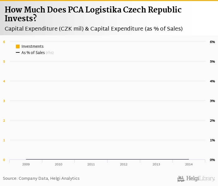PCA Logistika Czech Republic invested a total of CZK 0 mil in 2014, down 0% compared to the previous year. Historically, between 2009 - 2014, the company's investments stood at a high of CZK 0 mil in 2009 and a low of CZK 0 mil in 2014.