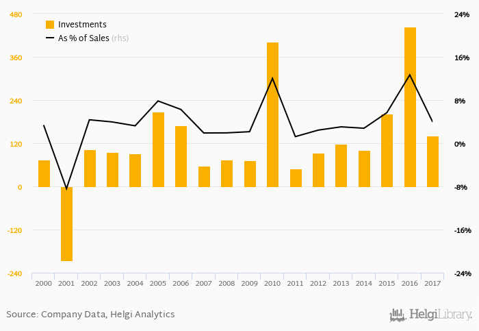 As a percentage of total sales, investments stood at 3.94% in 2017, down from 12.7% as seen in the previous year. This is compared to an average of 5.62% over the last five years.