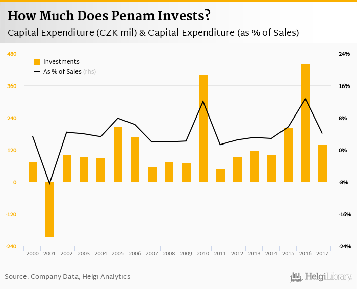 Penam invested a total of CZK 142 mil in 2017, down 68% compared to the previous year. Historically, between 2000 - 2017, the company's investments stood at a high of CZK 443 mil in 2016 and a low of CZK -205 mil in 2001.