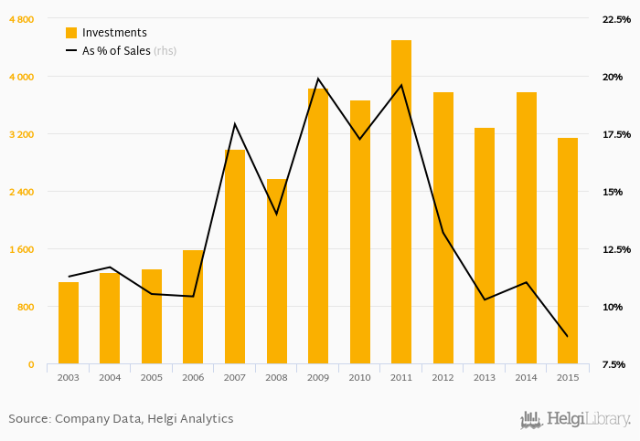 As a percentage of total sales, investments stood at 8.65% in 2015, down from 11.0% as seen in the previous year. This is compared to an average of 12.5% over the last five years.