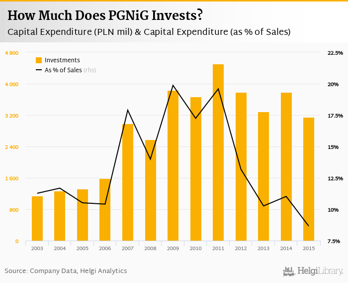 As far as PGNiG's peers are concerned, PKN invested PLN 3,079 mil, or 3.49% of its sales in 2015. Comparable figures for MOL are HUF 378,426 mil and 9.22%.