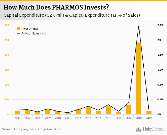 PHARMOS invested a total of CZK 13.0 mil in 2019, down 94.6% compared to the previous year. Historically, between 2006 - 2019, the company's investments stood at a high of CZK 241 mil in 2018 and a low of CZK 6.26 mil in 2011.