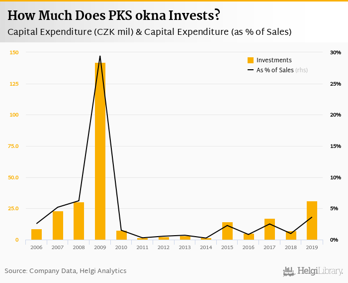 PKS okna invested a total of CZK 31.3 mil in 2019, up 335% compared to the previous year. Historically, between 2006 - 2019, the company's investments stood at a high of CZK 142 mil in 2009 and a low of CZK 1.51 mil in 2011.