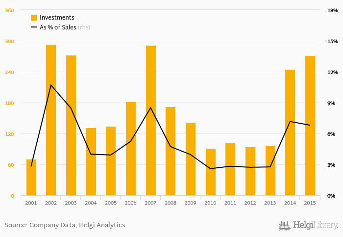 As a percentage of total sales, investments stood at 6.80% in 2015, down from 7.16% as seen in the previous year. This is compared to an average of 4.45% over the last five years.