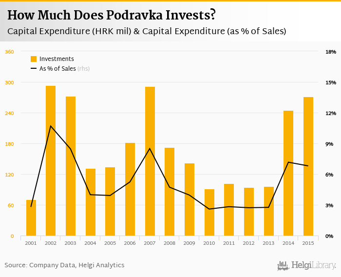 Podravka invested a total of HRK 271 mil in 2015, up 10.9% compared to the previous year. Historically, between 2001 - 2015, the company's investments stood at a high of HRK 294 mil in 2002 and a low of HRK 70.9 mil in 2001.