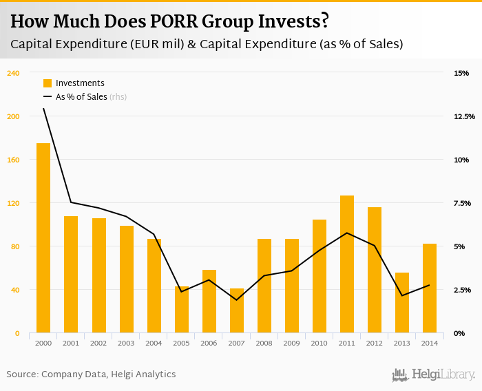 PORR Group invested a total of EUR 82.4 mil in 2014, up 47.4% compared to the previous year. Historically, between 2000 - 2014, the company's investments stood at a high of EUR 175 mil in 2000 and a low of EUR 41.4 mil in 2007.